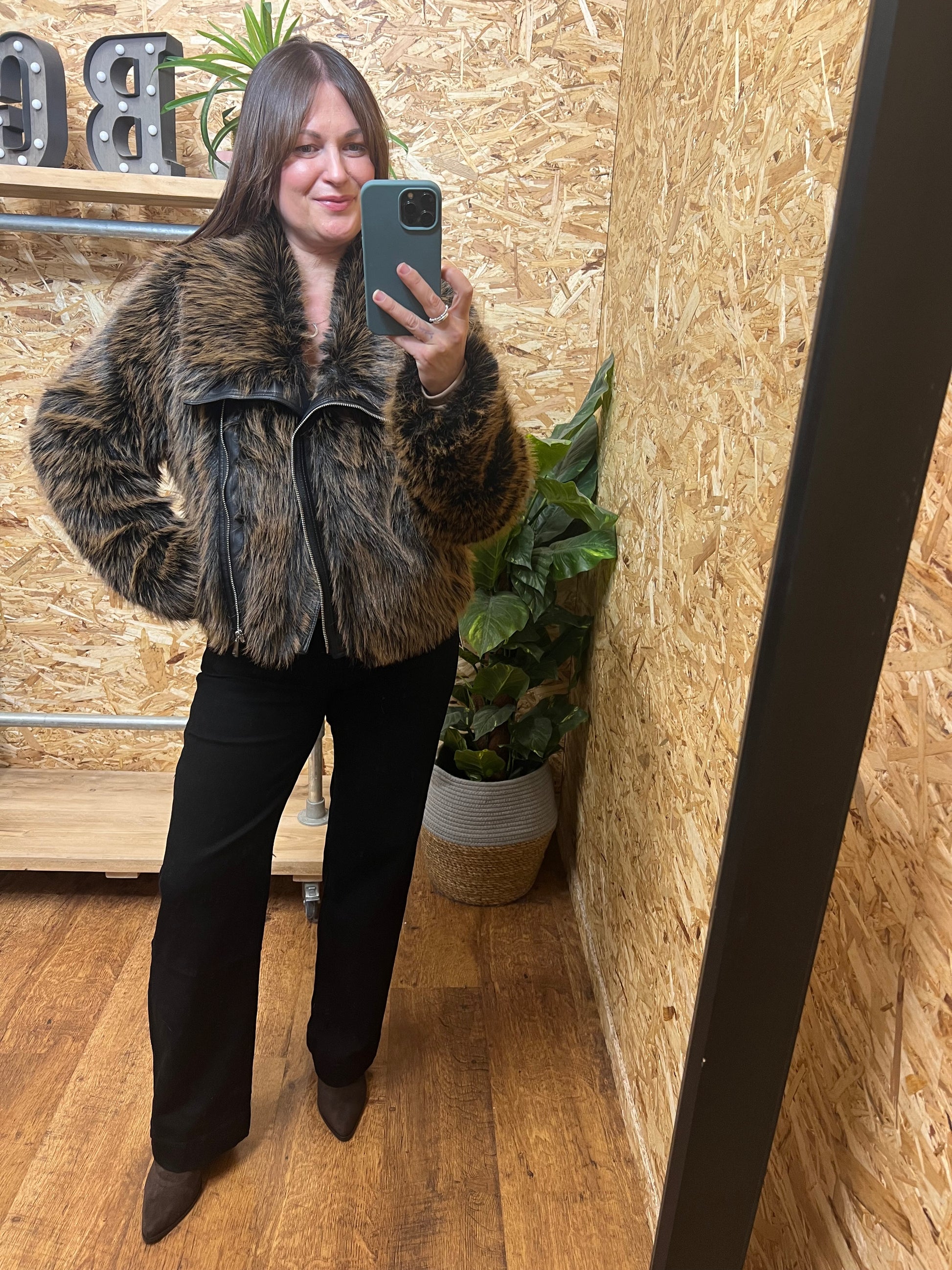 Turn heads in this fabulous faux fur biker style jacket. It is mix of rich brown and black tones with a luxe feel. It is finished with a sleek faux leather trim and zip detailing.